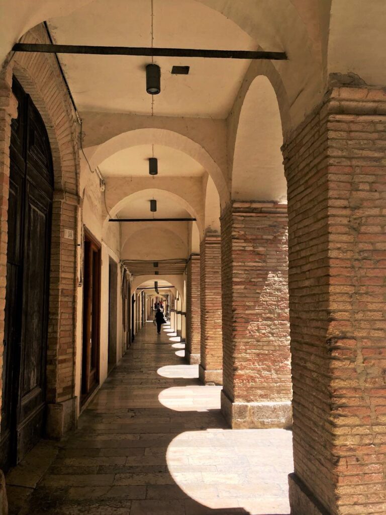 Quello che oggi è il Corso di Fossombrone era sin dall’epoca romana il tracciato della via Flaminia, la via consolare che da Rimini portava a Roma, percorsa da un flusso continuo di gente, merci, viaggiatori. In seguito al progressivo abbandono della città romana di Forum Sempronii, il nuovo centro abitato venne inizialmente rifondato sull’alta collina dove possiamo ancora oggi vedere quello che rimane della città alto-medievale (Cittadella). Dopo l’anno mille, la popolazione iniziò a scendere verso la Flaminia e il Metauro, e nei secoli il Corso prese a poco a poco l’aspetto che ha oggi, con i palazzi nobiliari e la doppia fila di portici. Da sempre sono curiosamente divisi in logge dei ricchi a sinistra (lato fiume), e logge dei poveri a destra (lato monte). Nelle logge dei ricchi si trovavano le attività più nobili, i cambiavalute, gli orefici, i banchieri; in quelle dei poveri, le attività più plebee, chiassose e sporche, come osterie, bettole, macellerie. Anche le tre chiese che presenti lungo il Corso (San Filippo, Sant’Agostino e Duomo) si trovano dal lato ritenuto ‘nobile’.